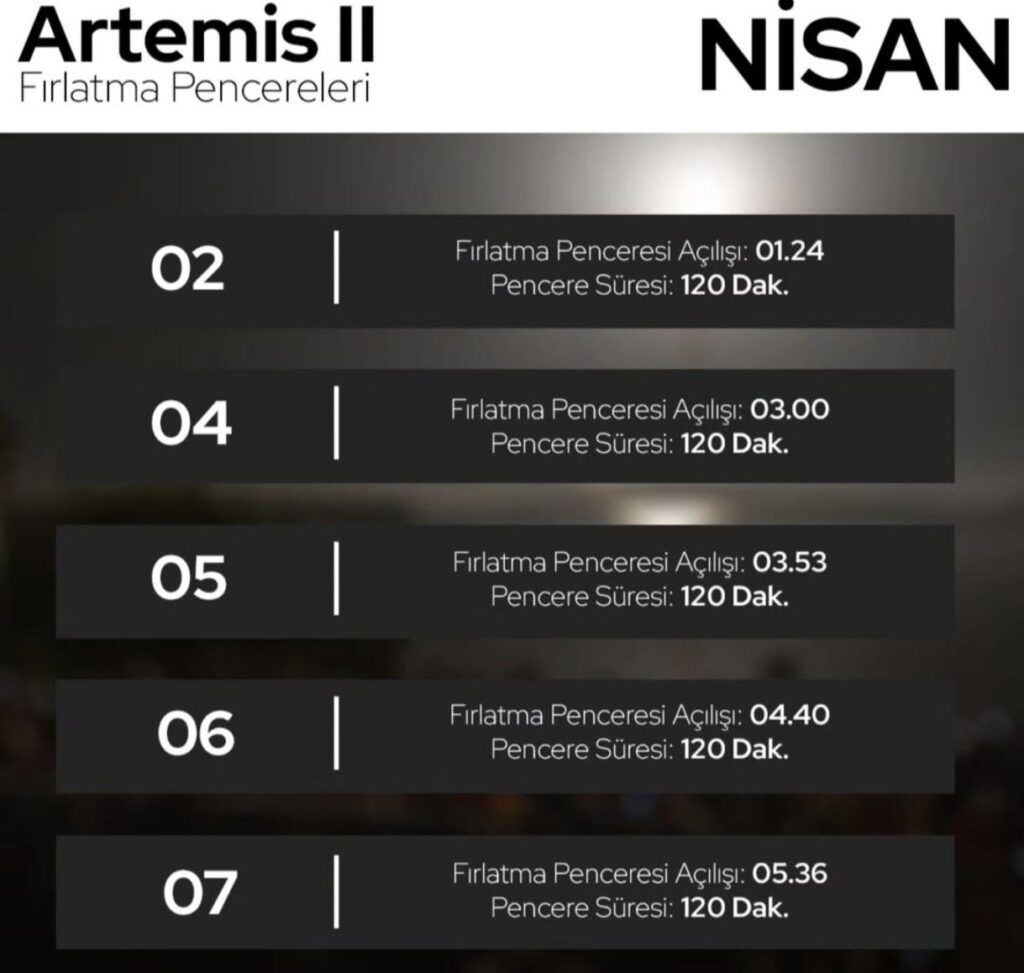 Paylaşılan bilgilere göre Nisan ayında birden fazla fırlatma penceresi bulunuyor. Her pencere yaklaşık iki saatlik bir zaman dilimini kapsıyor. Bu süreçte roketin hava koşulları, teknik sistemler ve yörünge dinamikleri açısından en uygun anda fırlatılması hedefleniyor.