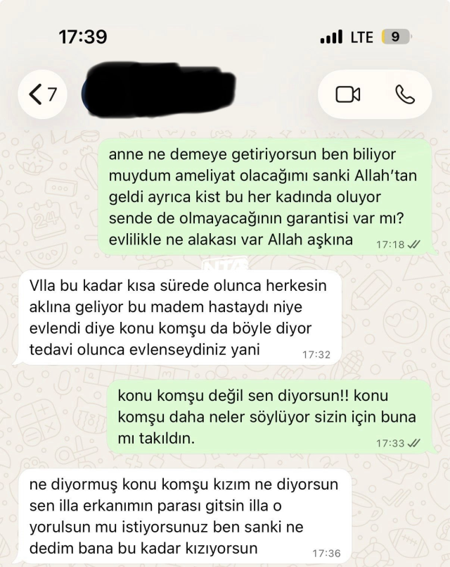 Genç kadın ise söz konusu mesajlara sert bir dille yanıt verdi. Ameliyat sürecinin önceden öngörülemediğini belirten kadın, “Ben ameliyat olacağımı biliyor muydum? Ayrıca bu bir kist, pek çok kadında görülebilen bir durum. Evlilikle ne ilgisi var?” diyerek sağlık durumunun evlilikle ilişkilendirilmesine tepki gösterdi. Tartışmanın ilerleyen bölümünde ise “Konu komşu değil, bunu sen söylüyorsun” sözleriyle kaynanasına doğrudan karşı çıktı.
