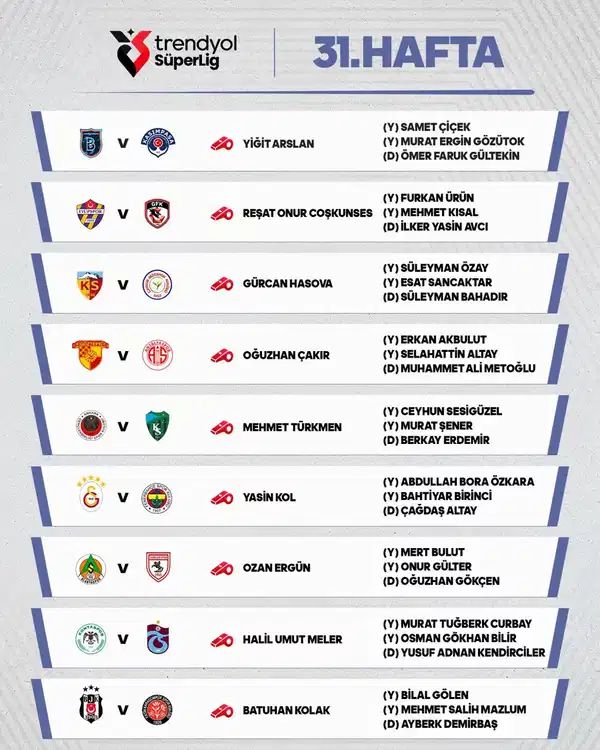 Trendyol Süper Lig’de 31. hafta maçlarını yönetecek hakemler şu şekilde sıralandı: